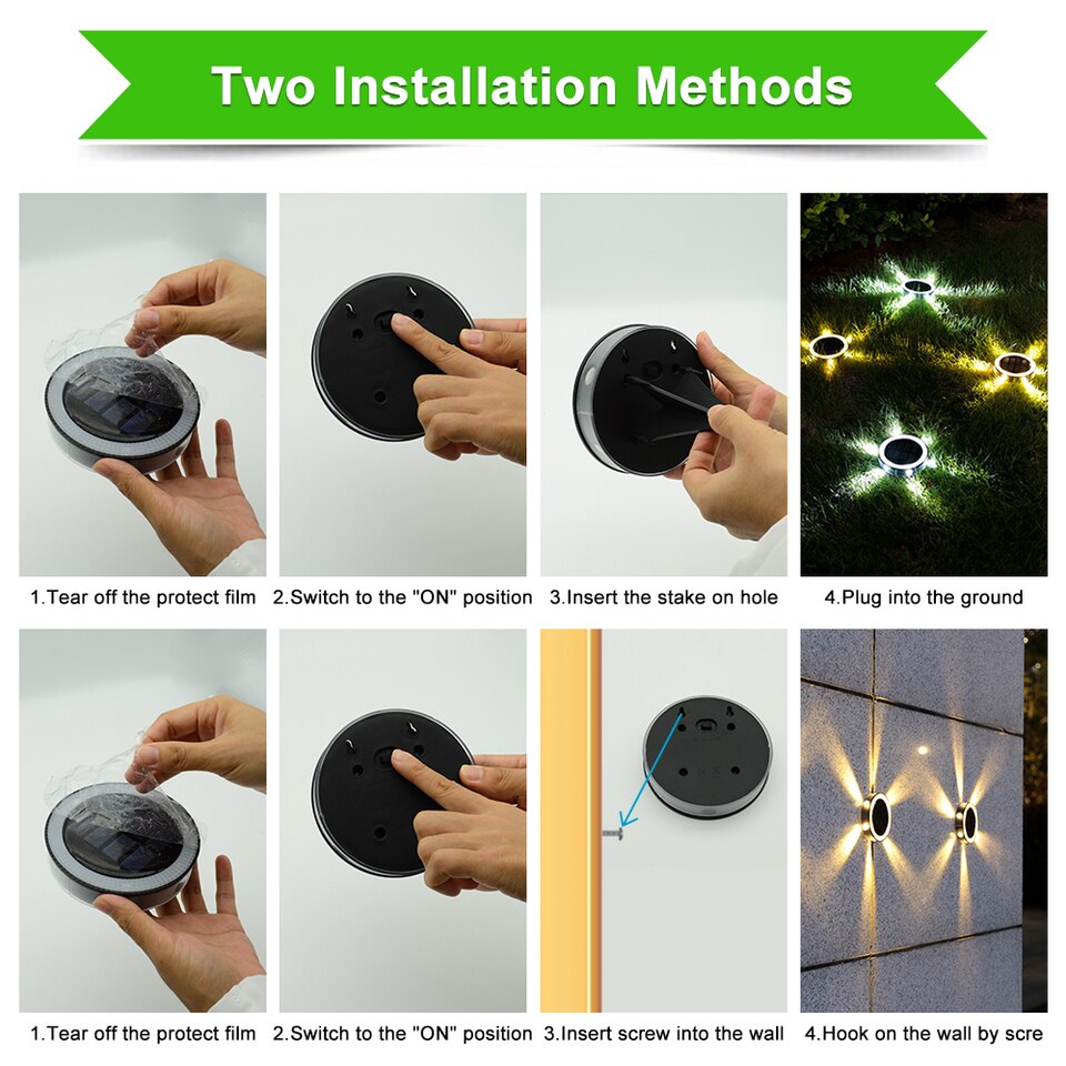 1.Tear off the protect film,2.Switch to ON position,3.Insert the stake on hole,4.Plug into the ground