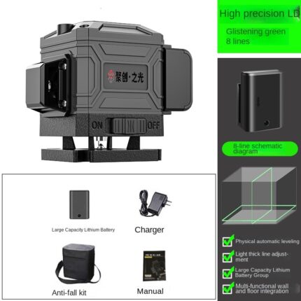 Specifications: Material: Aluminum Alloy Chassis Engineering Plastics Laser lines: 16 line Laser Color: Green Wall attachment distance:7mm Horizontal/Vertical Accuracy: ±1mm/7m