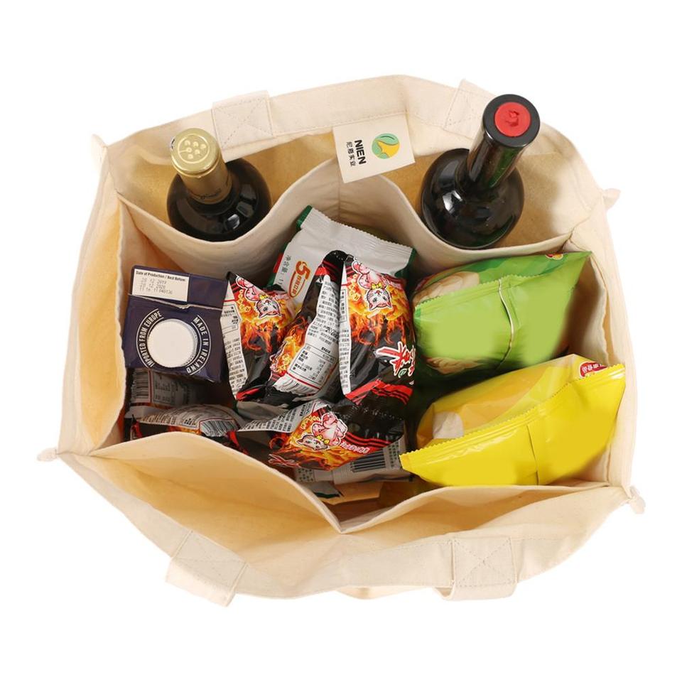 2. Sturdy and Perfect Canvas Shopping Bags: The package from organic cotton mart includes three reusable bags so you can fit everything you need. If you prefer, you can also just buy a single one of these reusable bags. Some of the most important features of the bag’s construction include: A large size that is identical to that of a paper bag (33cm tall, 19 wide, and 40cm length). 6 interior bottle sleeves, fabric handles which are extra wide, double stitched top hem